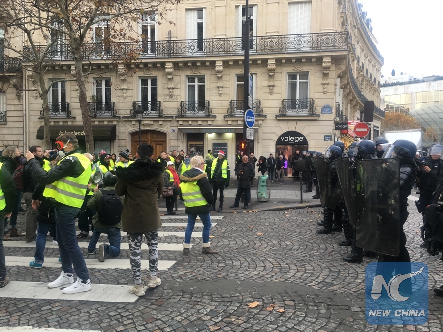 PARIS, Nov. 24 (Xinhua) -- A new round of "Yellow Vests" movement in Paris on Saturday was marred by violence after several hundred people had converged to the Champs-Elysees defying a police ban on protests in the capital's main avenue.