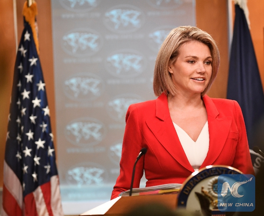 File Photo: U.S. State Department spokesperson Heather Nauert addresses a press briefing in Washington D.C., the United States, on Oct. 2, 2018. (Xinhua/Liu Jie)