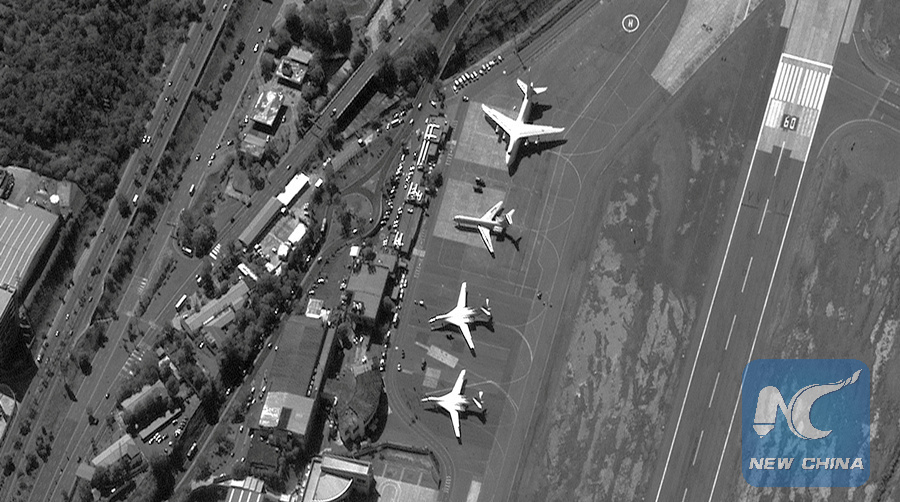 Four Russian military aircraft, including two Tu-160 bombers, one An-124 heavy-lift cargo airplane and an IL-62 passenger aircraft, are seen in this DigitalGlobe satellite image at Simon Bolivar Airport in Maiquetia, Venezuela on Dec. 10, 2018. (Reuters Photo)