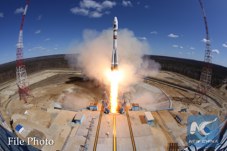 Photo taken on April 28, 2016 shows the launch of the Soyuz-2.1a carrier rocket with three small satellites -- Lomonosov, Aist-2D and SamSat-218 from the newly built Vostochny Cosmodrome in the Far Eastern Amur region. (Xinhua/Sputnik)