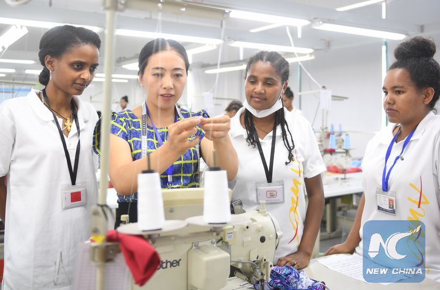 File photo shows Ethiopian workers of ANTEX Fashion Group learn sewing skill at a plant in Huzhou, east China's Zhejiang Province, Aug. 30, 2018. (Xinhua/Weng Xinyang)