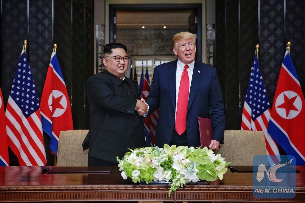 The photo shows top leader of the Democratic People's Republic of Korea (DPRK) Kim Jong Un (L) shakes hands with U.S. President Donald Trump during the signing ceremony of a joint statement in Singapore on June 12, 2018. (Xinhua/Ministry of Communication and Information of Singapore)