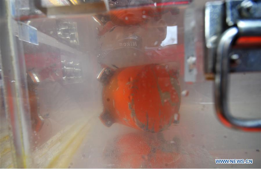 A cockpit voice recorder, the second black box of Lion Air flight 610, is seen in the water in Karawang, West Java province of Indonesia, Jan. 14, 2019. (Xinhua/Zulkarnain)