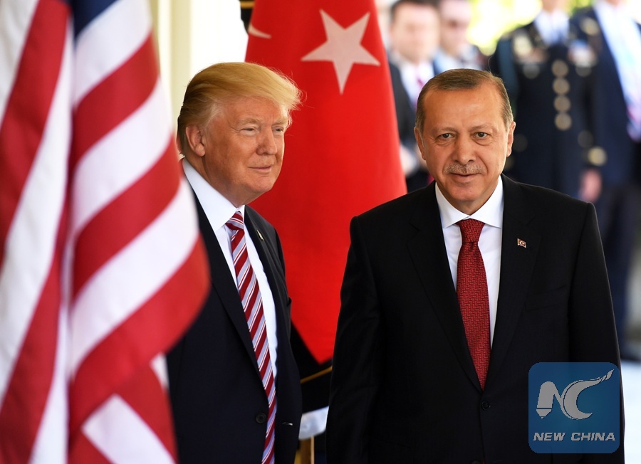 The file photo shows that U.S. President DonaldTrump (L) welcomes Turkish President Recep Tayyip Erdogan at the White House in Washington D.C., the United States, on May 16, 2017. (Xinhua/Yin Bogu)