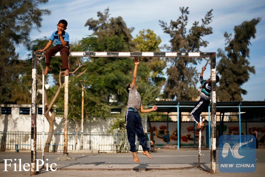 Displaced Palestinian boys play after they fled from their homes with their families to a UN-run school in Gaza City on Nov. 21, 2012. (Reuters File photo)