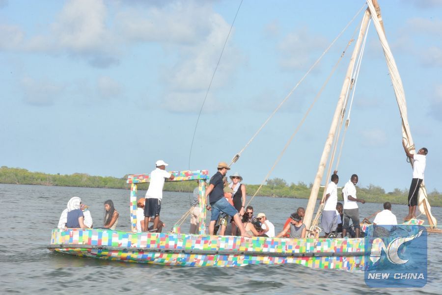 File photo shows revellers ride in a newly launched world's first 100% recycled plastic sail boat in Lamu County, Kenya, Sept. 15, 2018. (Xinhua/Charles Onyango)