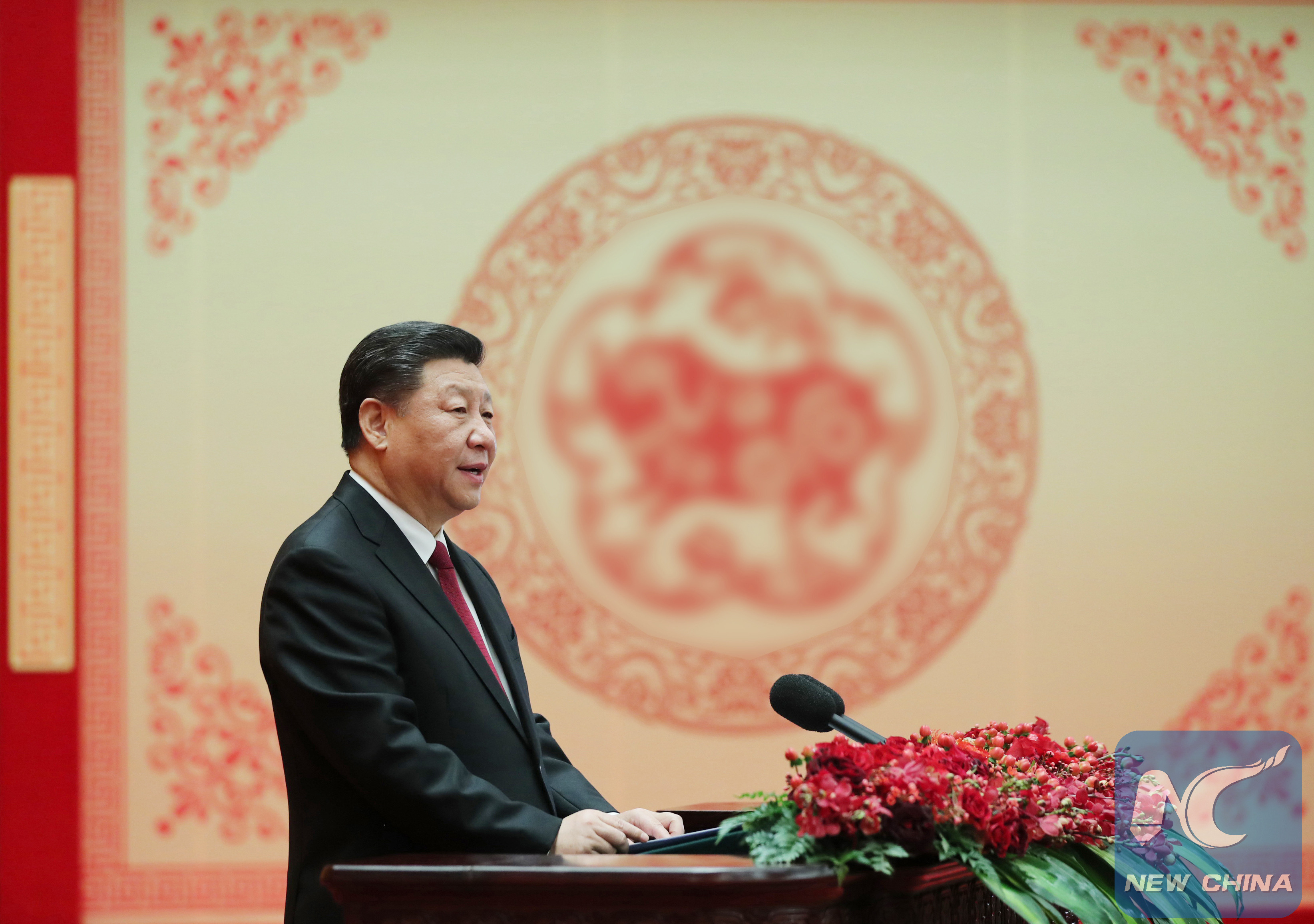 Chinese President Xi Jinping, also general secretary of the Communist Party of China (CPC) Central Committee and chairman of the Central Military Commission, addresses a Spring Festival reception at the Great Hall of the People in Beijing, capital of China, Feb. 3, 2019. (Xinhua/Ju Peng)