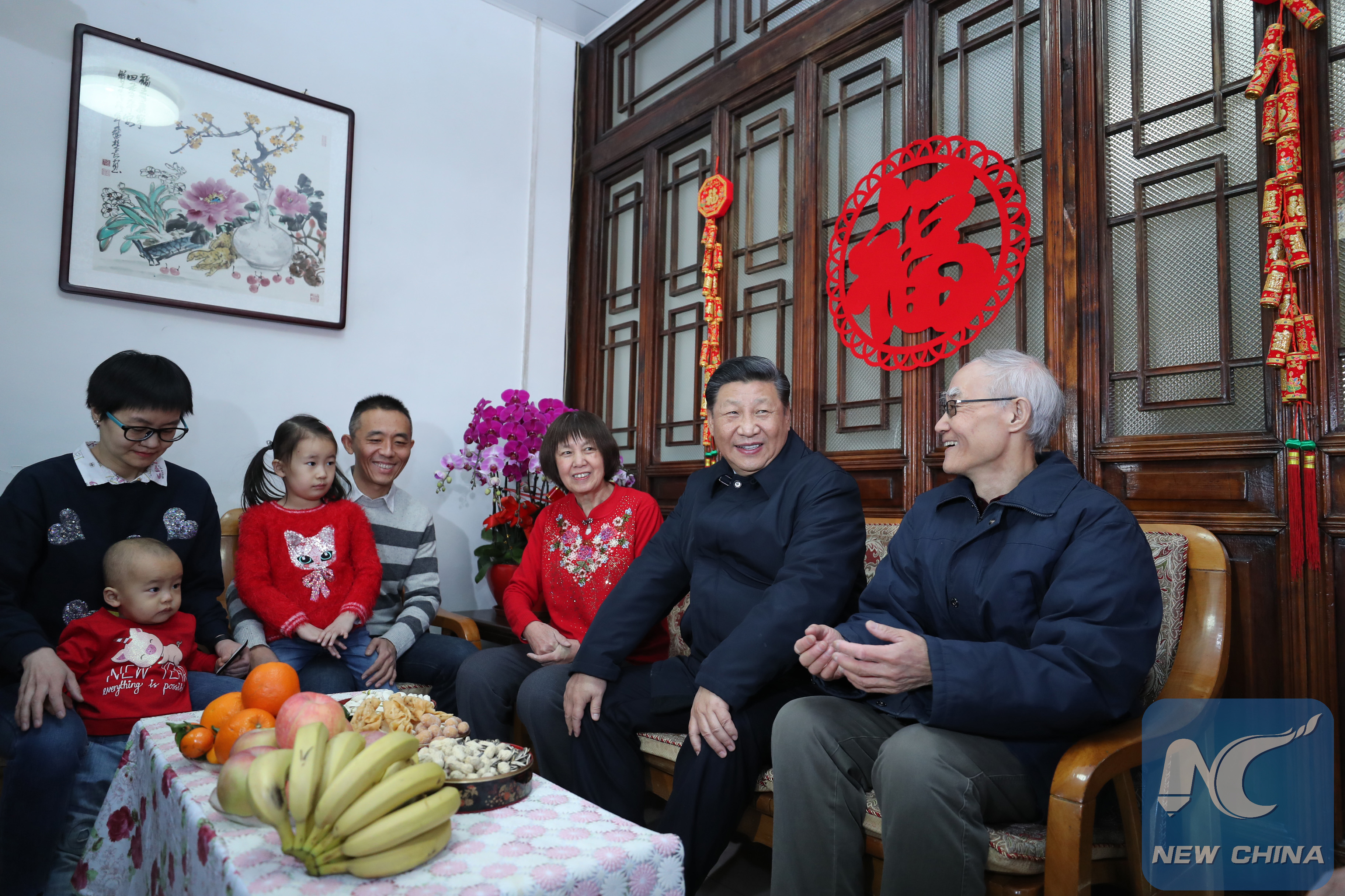 Chinese President Xi Jinping, also general secretary of the Communist Party of China Central Committee and chairman of the Central Military Commission, comes to the home of Zhu Maojin in Qianmen area in central Beijing, capital of China, Feb. 1, 2019. (Xinhua/Ju Peng)