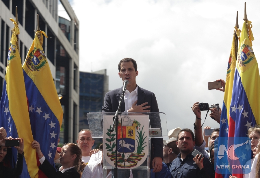 File Photo: Juan Guaido (C), head of the opposition-controlled National Assembly, delivers a speech at the Francisco de Miranda avenue, in Caracas, Venezuela, on Jan. 23, 2019. (Xinhua/Boris Vergara)