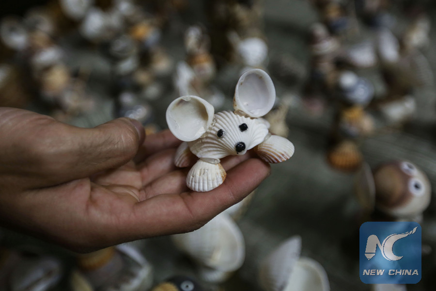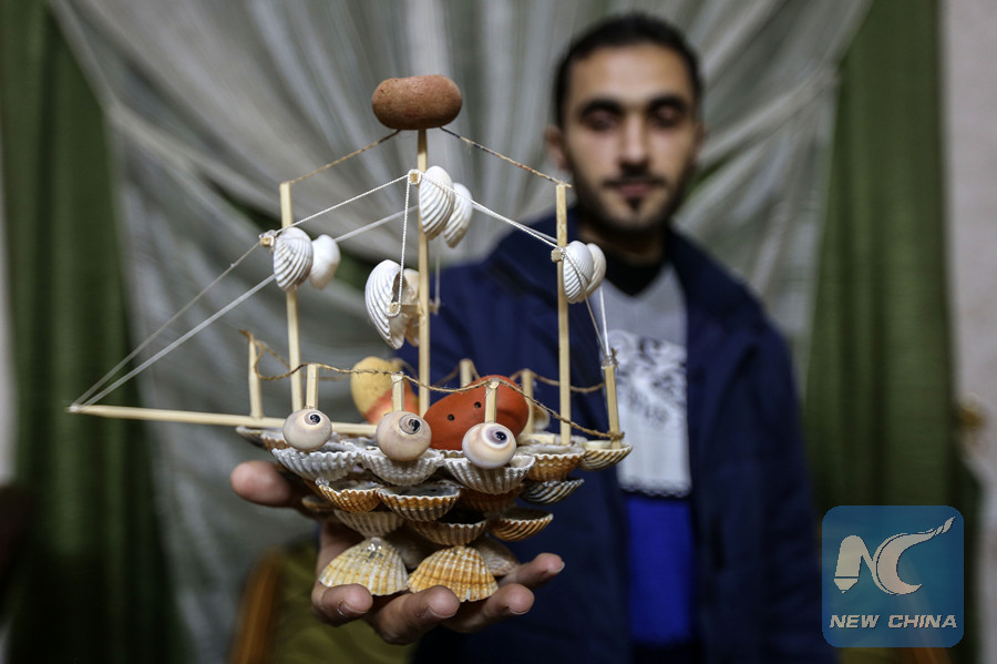 "Collecting shells and snails attracted me to transform them into artistic forms to develop my talent and passion for this art," al-Madhoun, a father of two children, told Xinhua as he used a hot melt glue gun to stick pieces together.