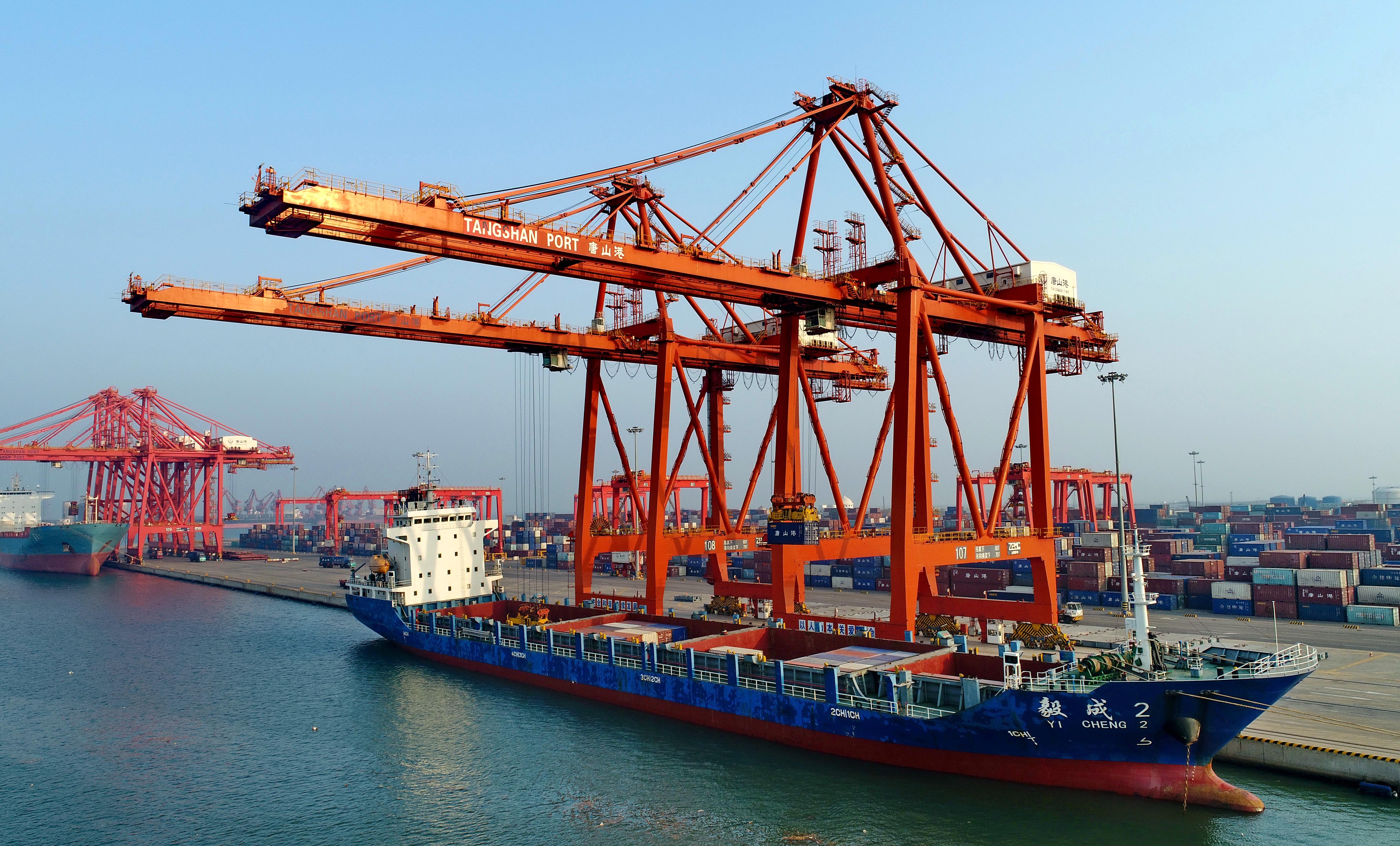 Aerial photo taken on Nov. 12, 2018 shows a cargo ship berthing in a dock of the Port of Jingtang in Tangshan, north China's Hebei Province. (Xinhua/Yang Shiyao)