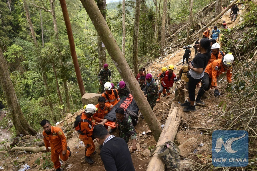 Members of Indonesian Search and Rescue (SAR) team pull out a body of a gold miner after an unlicensed gold mine collapsed at Bolaang Mongondow district of North Sulawesi province, Indonesia, Feb. 28, 2019. (Xinhua/Stringer)