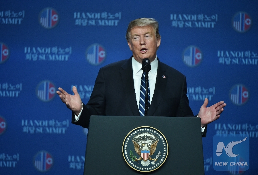File Photo: U.S. President Donald Trump speaks at a press conference in Hanoi, Vietnam, Feb. 28, 2019. (Xinhua/Wang Shen)