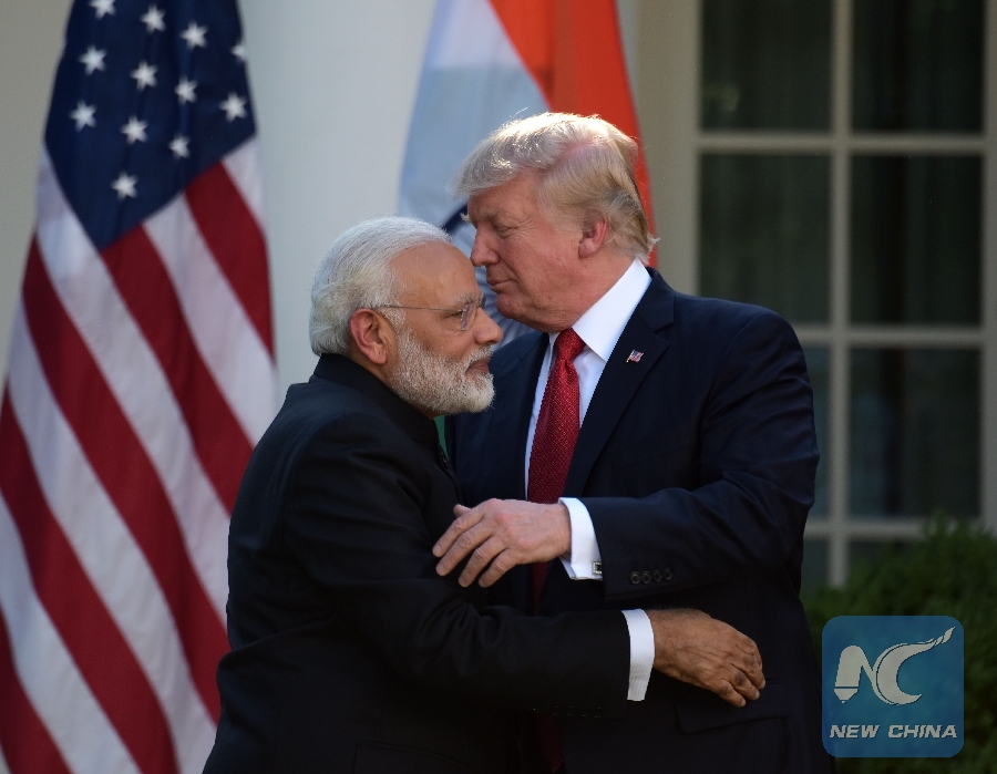 File Photo: U.S. President Donald Trump (R) and Indian Prime Minister Narendra Modi hug after giving joint statements at the White House in Washington D.C., the United States, June 26, 2017. (Xinhua/Yin Bogu)