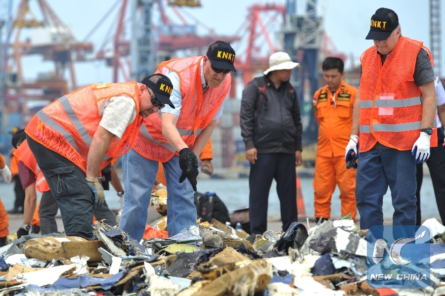 United States' National Transportation Safety Board and Indonesia's National Transportation Safety Committee officials check the debris of the crashed Lion Air JT 610 during their investigation of the air plane crash at The Tanjung Priok port, Jakarta, Indonesia, Nov. 1, 2018. (Xinhua/Veri Sanovri)