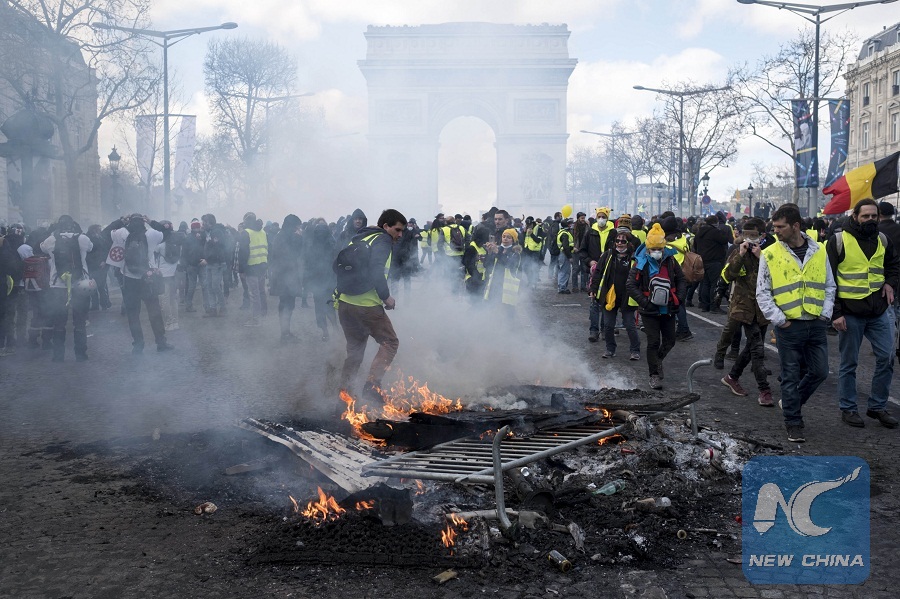 "Yellow Vest" protesters burn barriers on the Champs-Elysees Avenue in Paris, France, on March 16, 2019. French police arrested more than 200 people on Saturday after violence broke out in Paris in a fresh protest of "Yellow Vest" movement. (Xinhua/Alexandre Karmen)