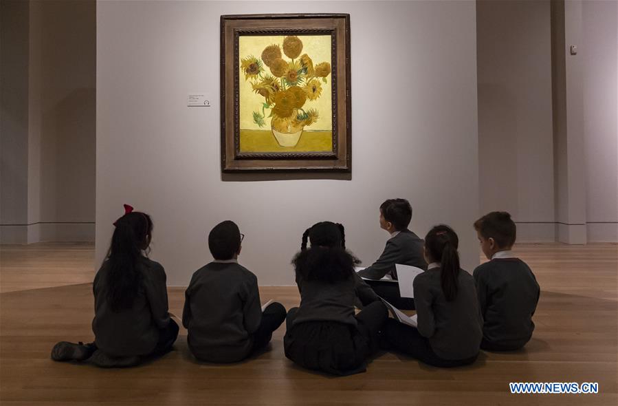 Children look at the painting 'Sunflowers' by artist Vincent van Gogh during the preview for the Van Gogh and Britain exhibition at Tate Britain in London, Britain on March 25, 2019. The exhibition will be open from March 27 to August 11. (Xinhua/Han Yan)