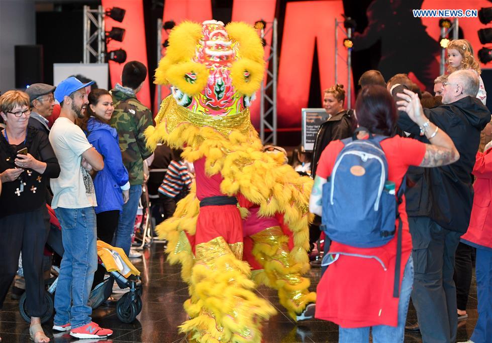 Lion dancers interact with participants during the Chinese Community Stage Festival at Museum of New Zealand in Wellington, New Zealand, March 9, 2019. (Xinhua/Guo Lei)