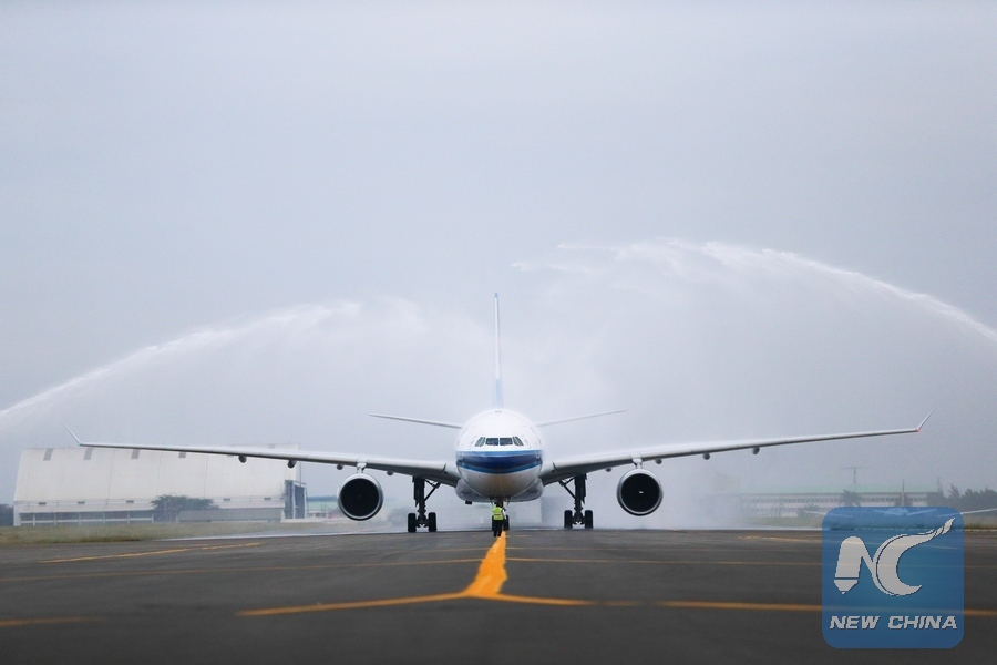 The aircraft of CZ633 arrives in Nairobi, capital of Kenya, on Aug. 5, 2015. China Southern Airlines launched a direct flight to Kenya on Wednesday. The Guangzhou-Nairobi route will operate three flights a week and using Airbus 330 jets. (Xinhua/Pan Siwei)