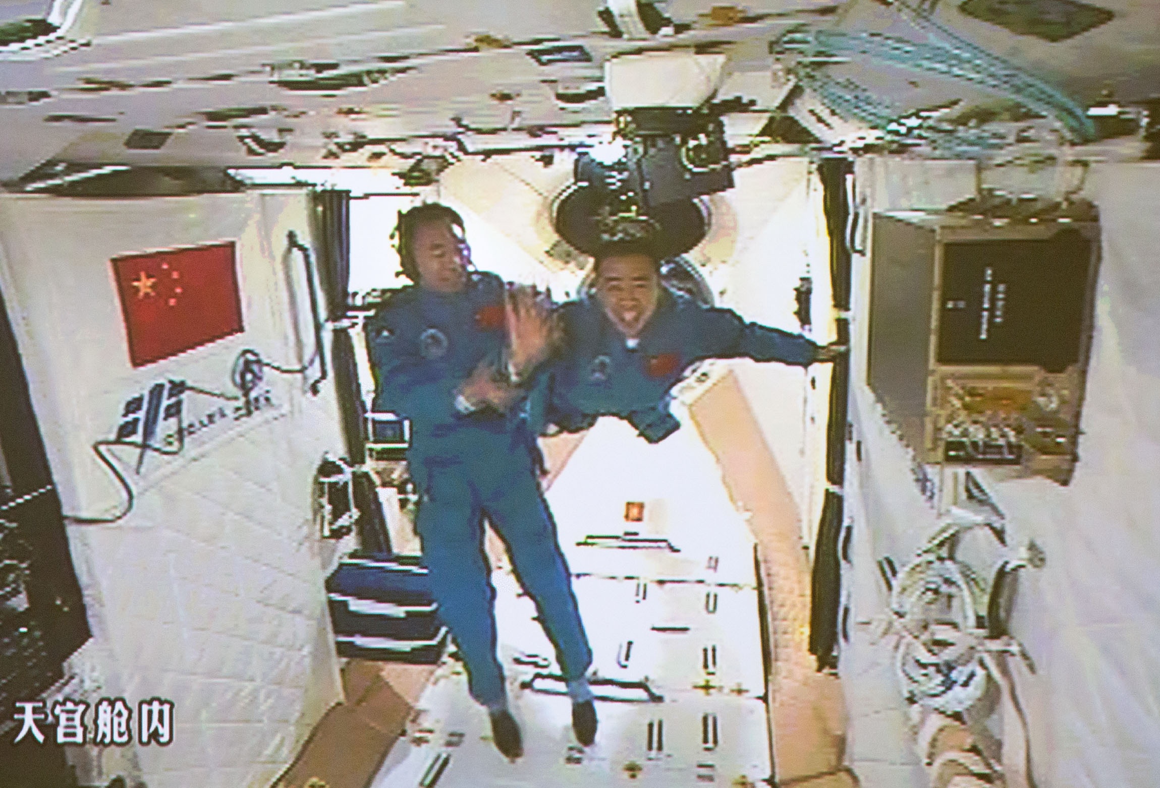 The screen at the Beijing Aerospace Control Center shows the two Chinese astronauts Jing Haipeng (L) and Chen Dong entering the space lab Tiangong-2, Oct. 19, 2016. (Xinhua/Ju Zhenhua)