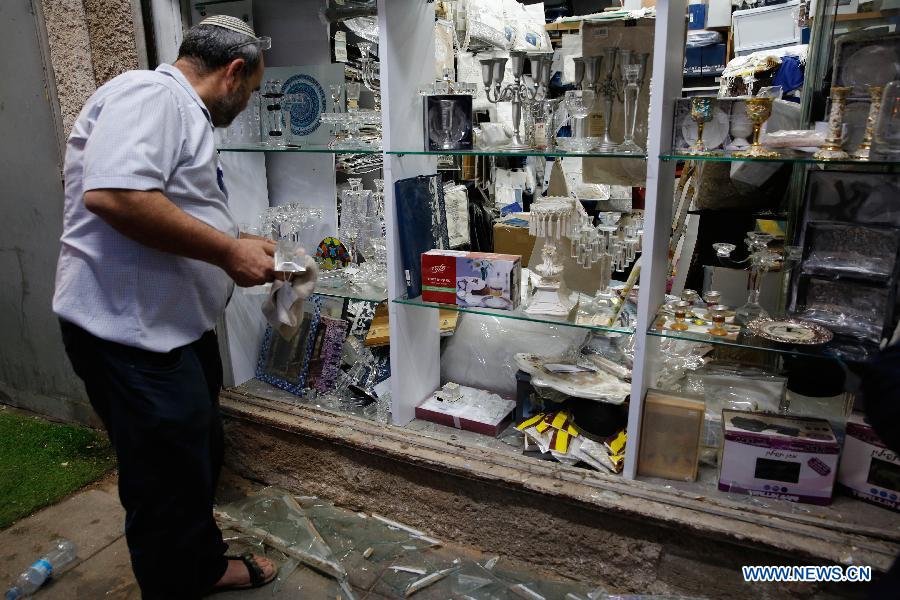 An Israeli man looks at damaged items in a building that was damaged by a rocket fired from the Gaza Strip, in the southern Israeli city of Ashdod, on May 6, 2019. A ceasefire deal that has been reached between Israel and Palestinian resistance factions in Gaza has come into effect on Monday dawn. (Xinhua/Gil Cohen Magen)