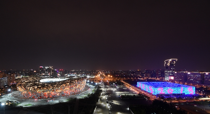 Photo taken on April 10, 2019 shows the night view of the National Stadium (L), also known as the Bird's Nest, and the National Aquatics Center, or the Water Cube, in Beijing. (Xinhua/Chen Yehua)