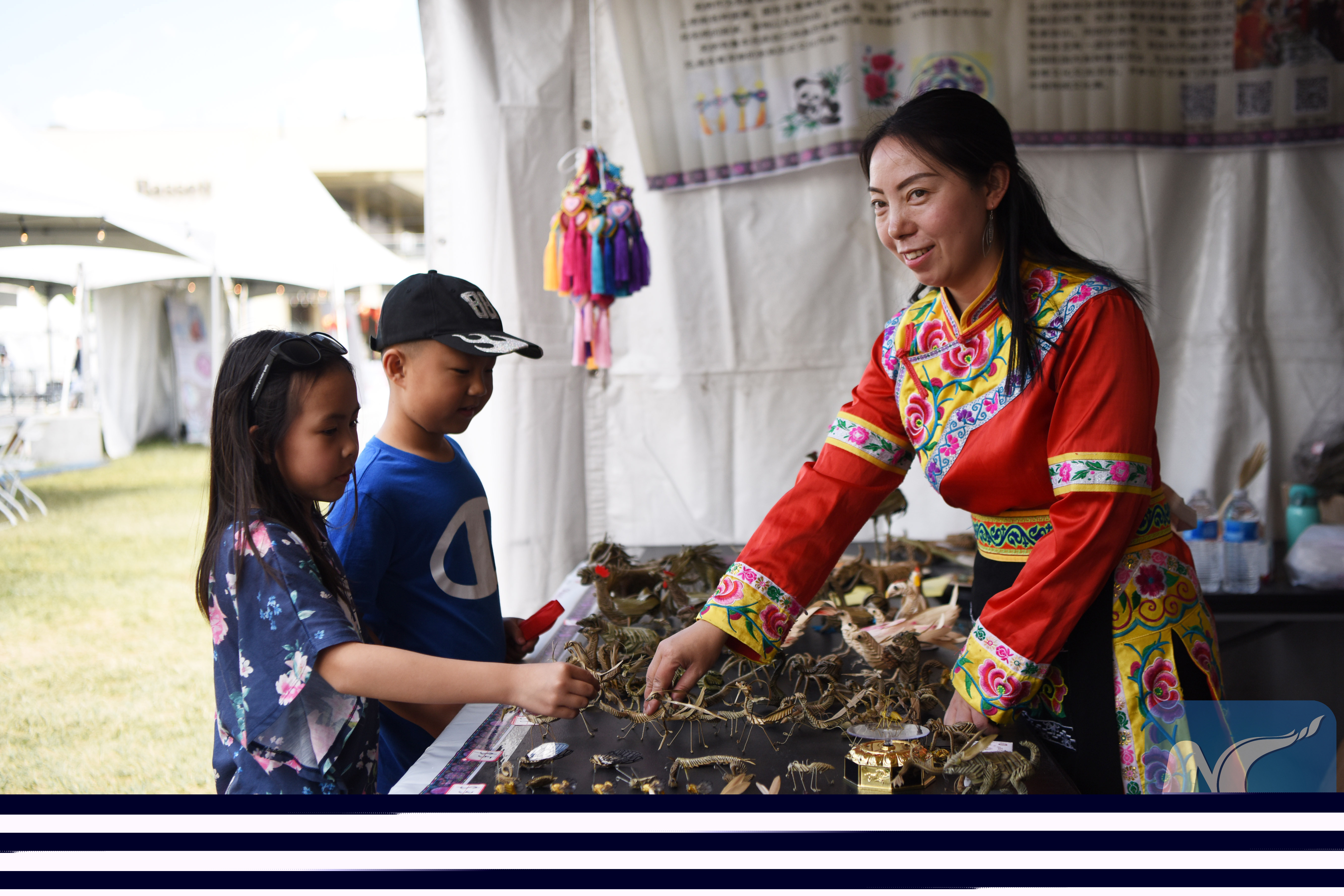 Jiang Furong (R), representative inheritor of China's intangible cultural heritage Qiang traditional grass weaving, shows grass weaving products to children at the 2019 U.S.-China Cultural Tourism Festival in Las Vegas, the United States, May 11, 2019. (Xinhua/Han Fang)