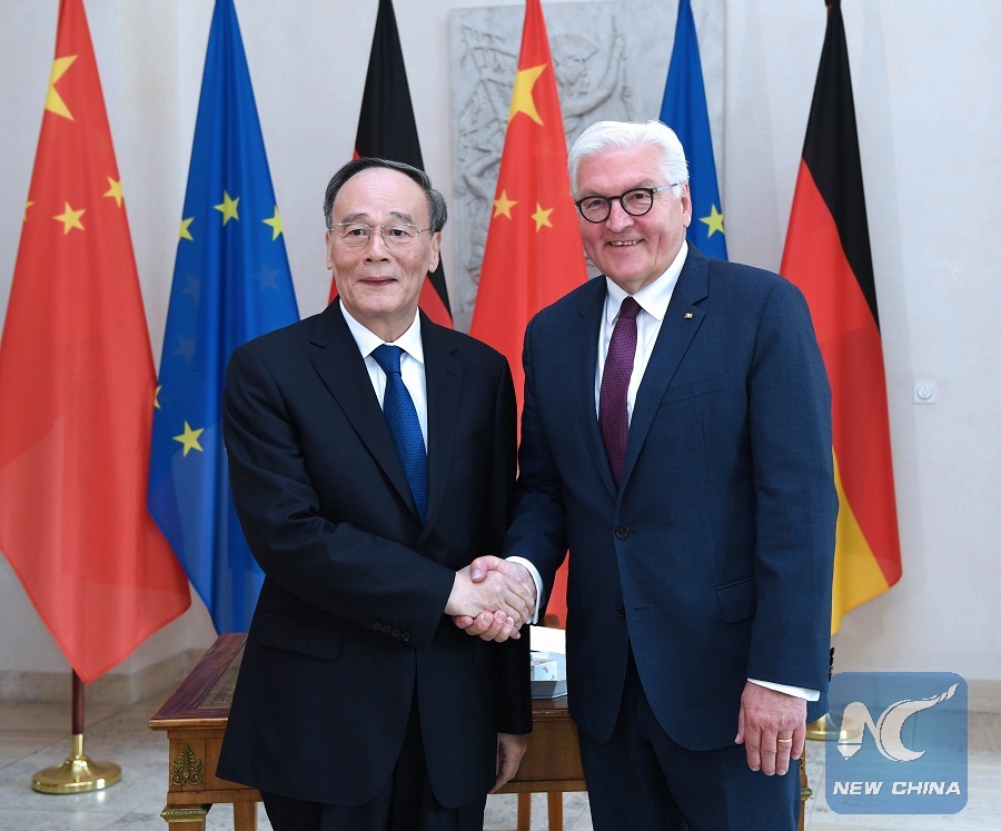 Chinese Vice President Wang Qishan (L) meets with German President Frank-Walter Steinmeier in Berlin on May 31, 2019. (Xinhua/Rao Aimin)