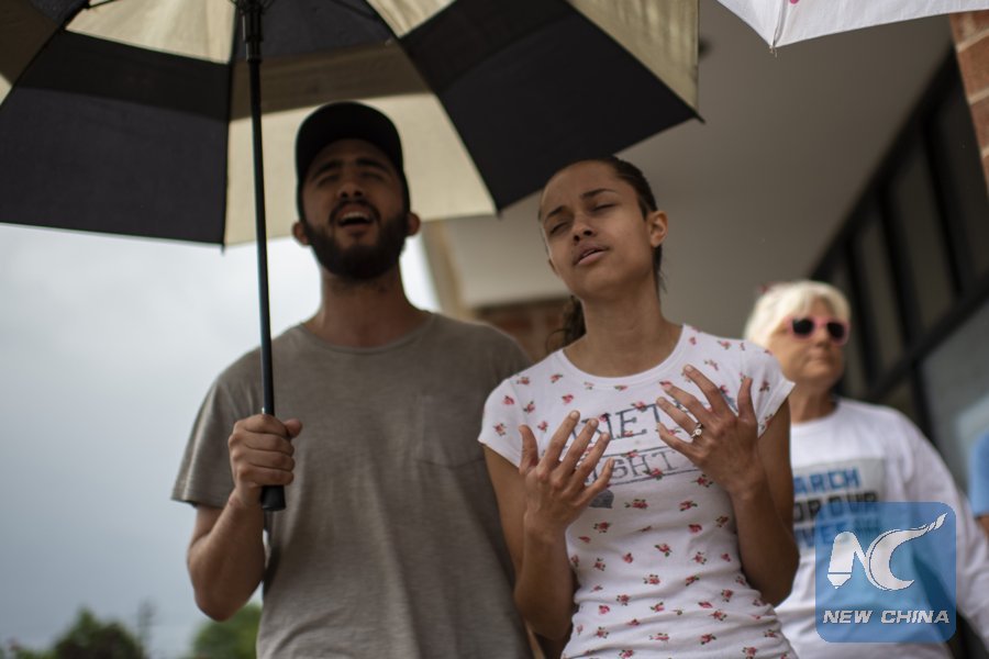 Mourners pray for the victims of the mass shooting, on June 1, 2019, during a vigil in the parking lot of a shopping center inVirginia, Beach, Virginia. (AFP Photo)