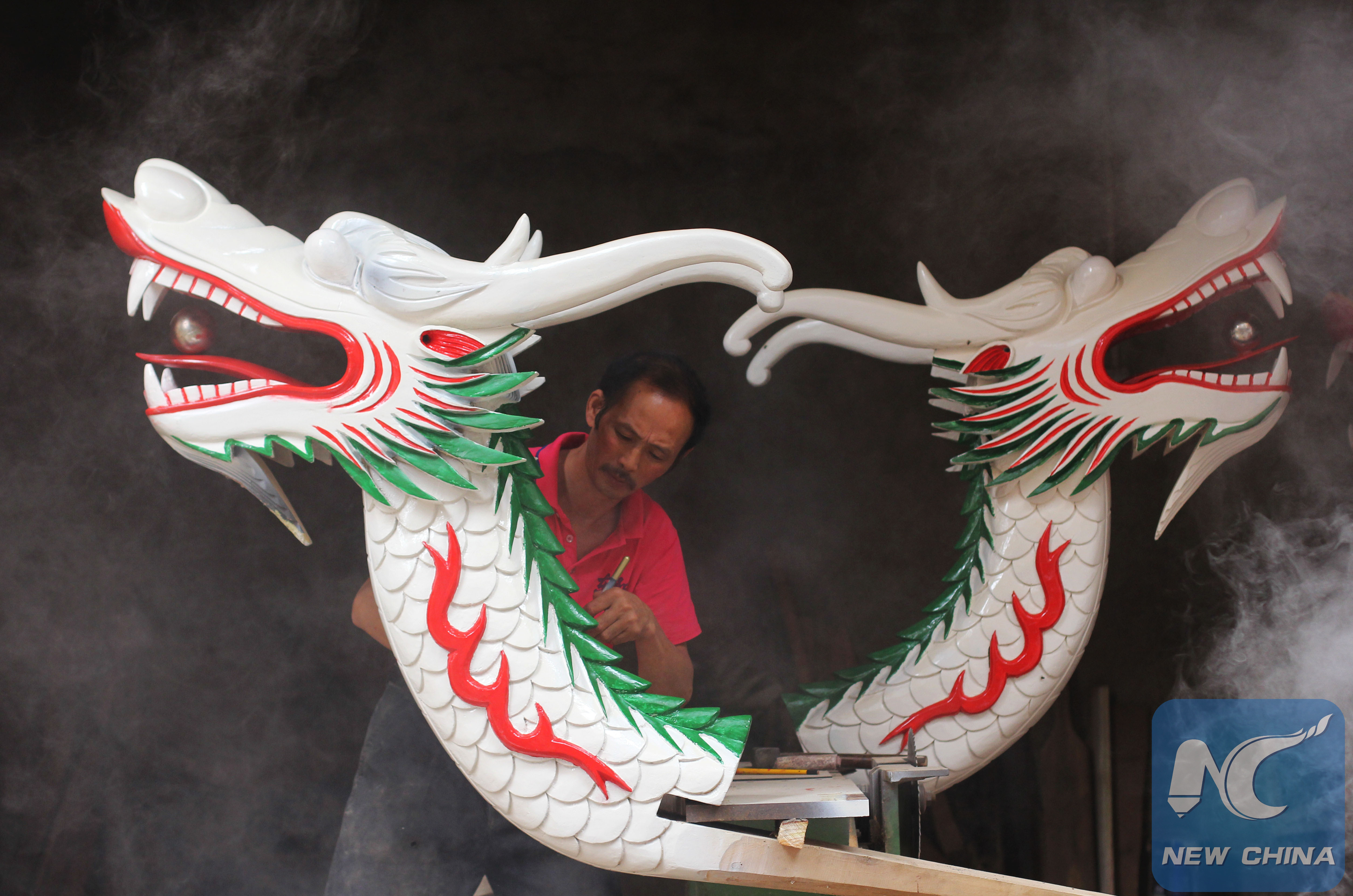 A folk artist lacquers the dragon head for the bow of a dragon boat in Daoxian County of Yongzhou City, central China's Hunan Province. (Xinhua/He Hongfu)