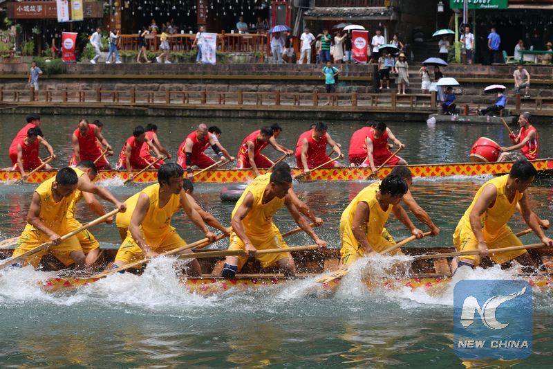 Participants compete during a dragon boat contest in the Tuojiang River of Fenghuang ancient town, Hunan Province. (Xinhua/Peng Biao)
