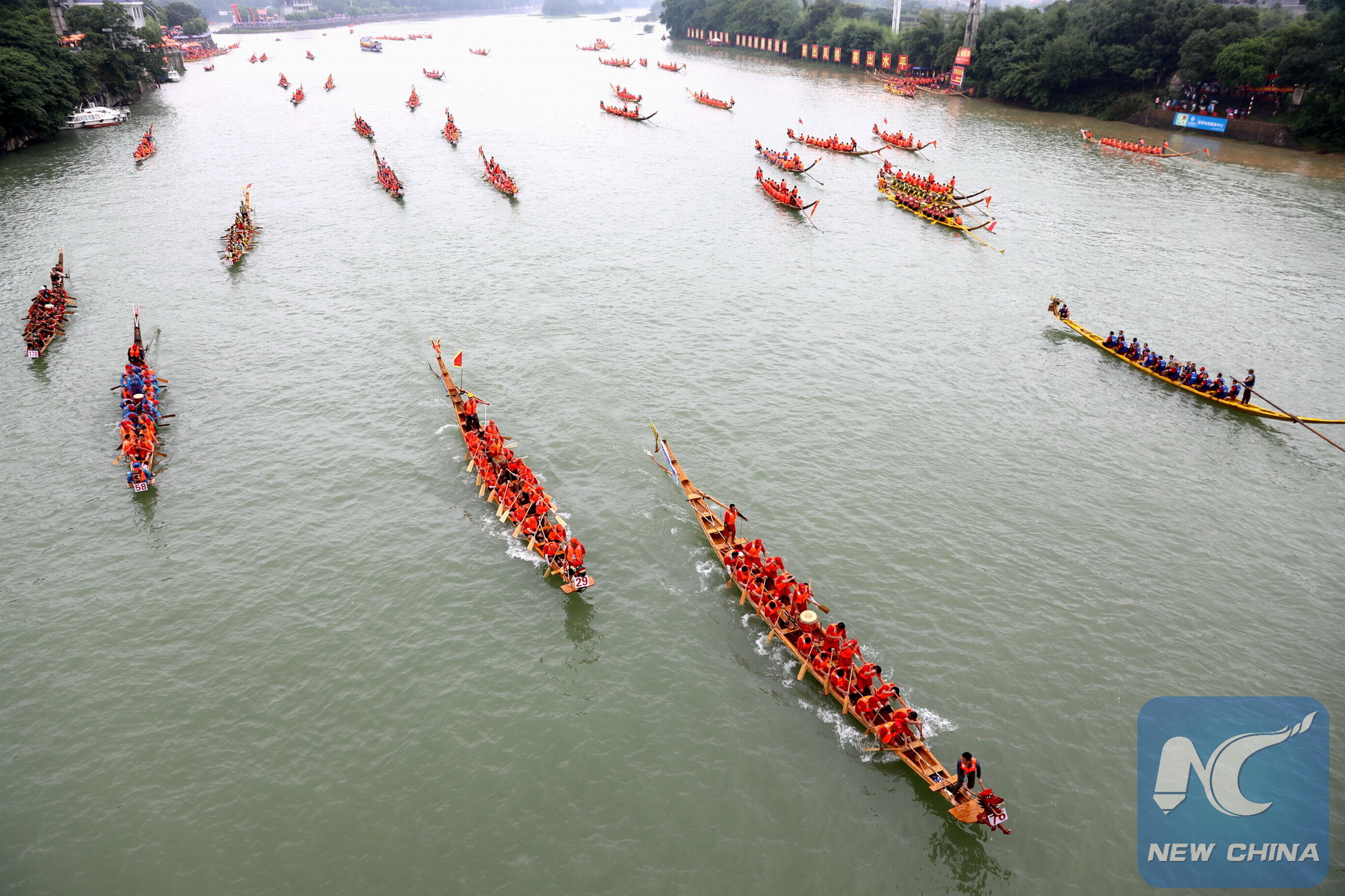 Aerial photo shows people participating in a dragon boat race held on Xiaoshui River in Daoxian County, central China's Hunan Province. (Xinhua/He Hongfu)