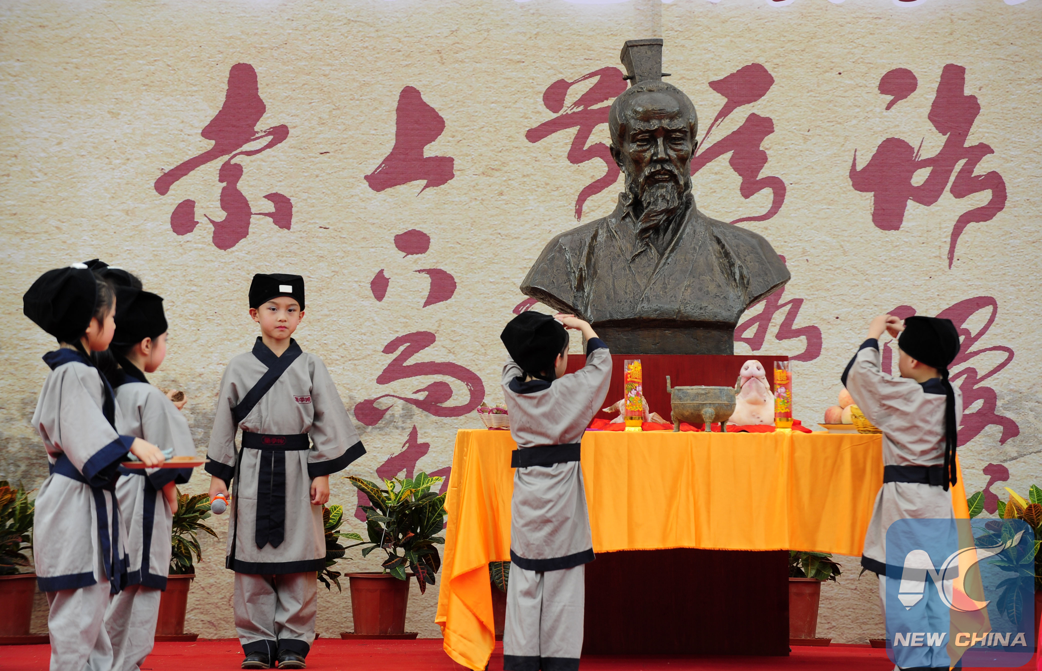 Children dressed in traditional clothes commemorate Qu Yuan, a patriot poet during the Warring State Period (475-221 BC), at the East Lake scenic area in Wuhan, capital of central China's Hubei Province. (Xinhua/Hao Tongqian)