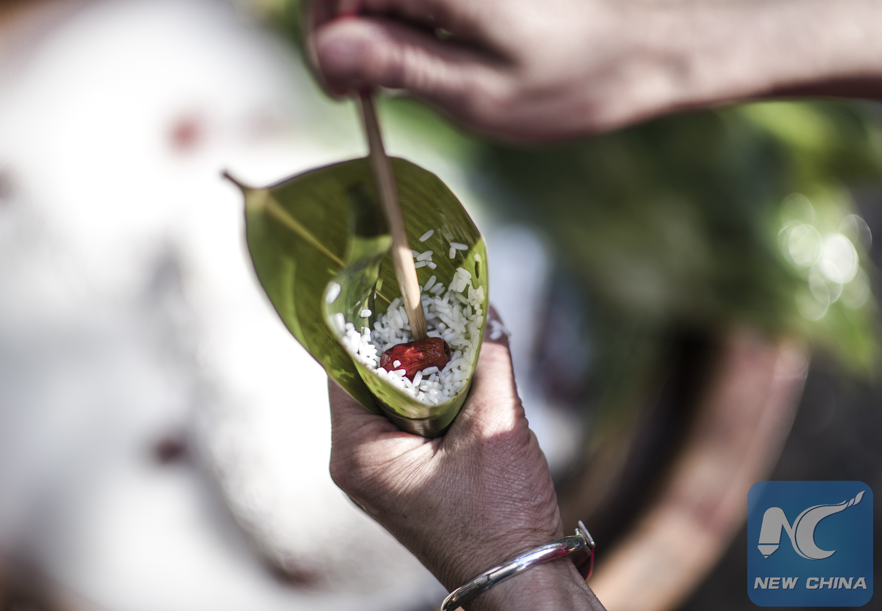 People make zongzi in Zigui County, Hubei Province. (Xinhua/Xiao Yijiu)