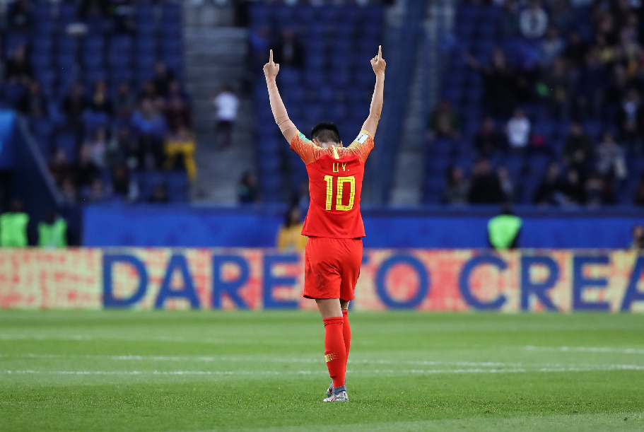 Li Ying of China celebrates her scoring during the Group B match between China and South Africa at the 2019 FIFA Women's World Cup in Parc des Princes in Paris, France, June 13, 2019. (Xinhua/Shan Yuqi)