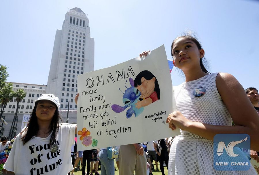 Demonstrators holding signs march against the separation of immigrant families in Los Angeles, the United States, on June 30, 2018.(Xinhua/Zhao Hanrong)