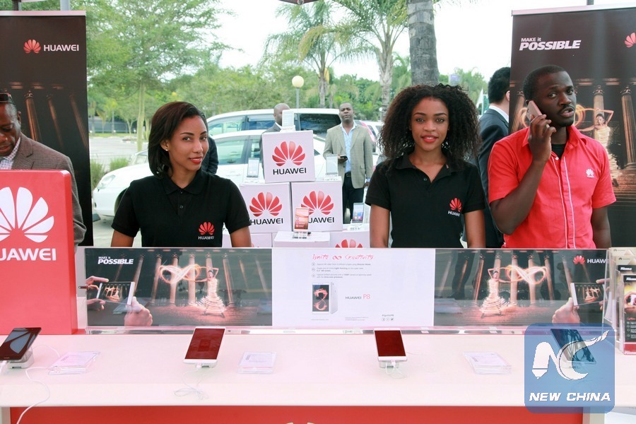 Local employees introduce the company's cellphones during a show by Chinese tech firm Huawei in Lusaka, Zambia, April 13, 2016. Chinese tech firm Huawei on Wednesday held a show in Zambia of its high-end products and services. (Xinhua/Peng Lijun)