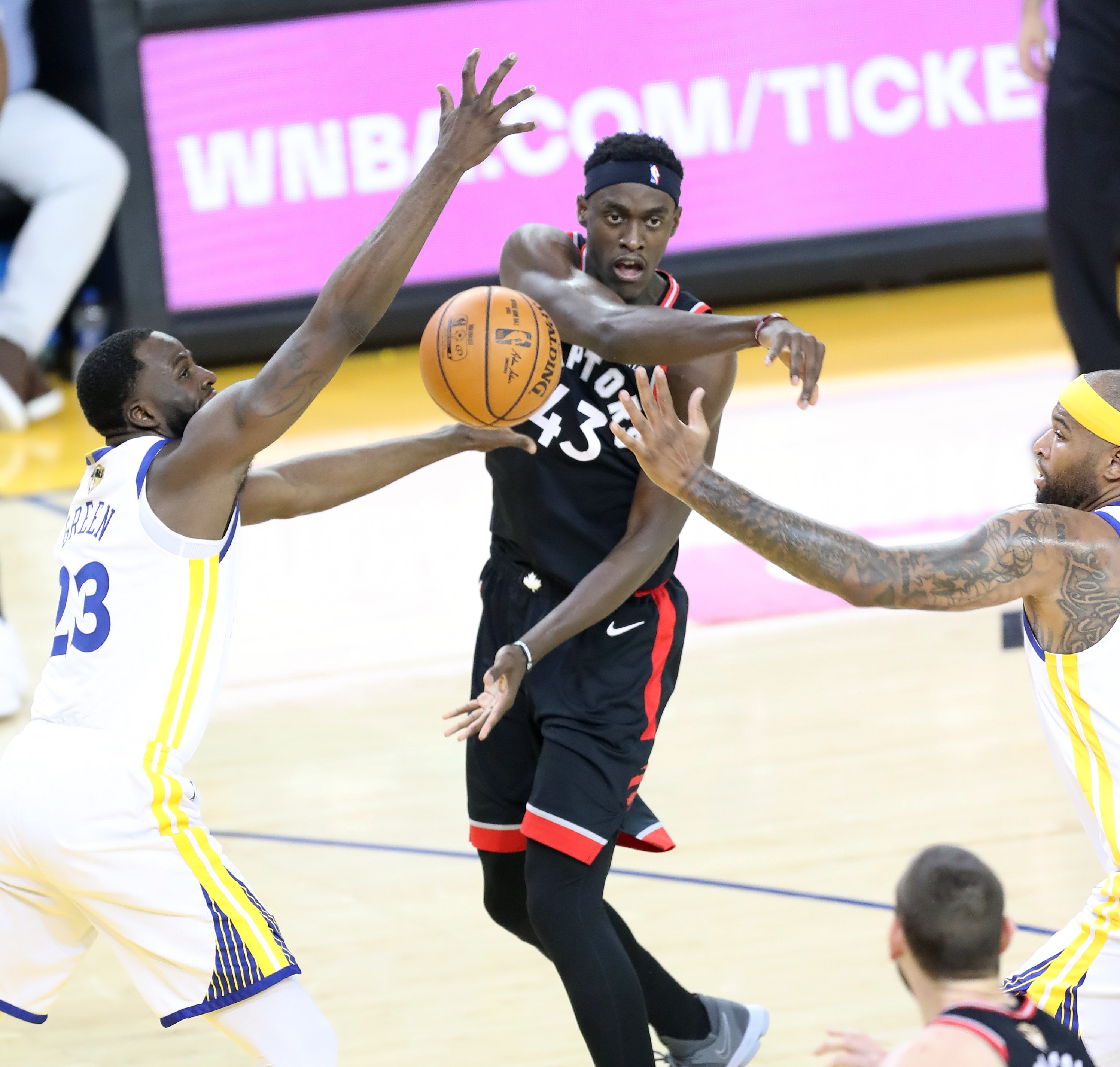 Pascal Siakam of the Toronto Raptors passes the ball in Game 3 of the NBA Finals in San Francisco, California on June 5, 2019. (Xinhua/Dong Xudong)