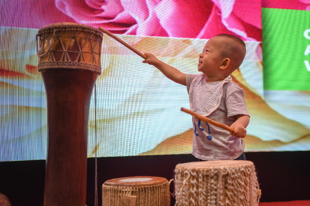 Photo taken on June 28, 2019 shows a little boy having fun at the exhibition site of the China-Africa Economic and Trade Expo in Changsha, central China's Hunan Province. (Xinhua/Xue Yuge)