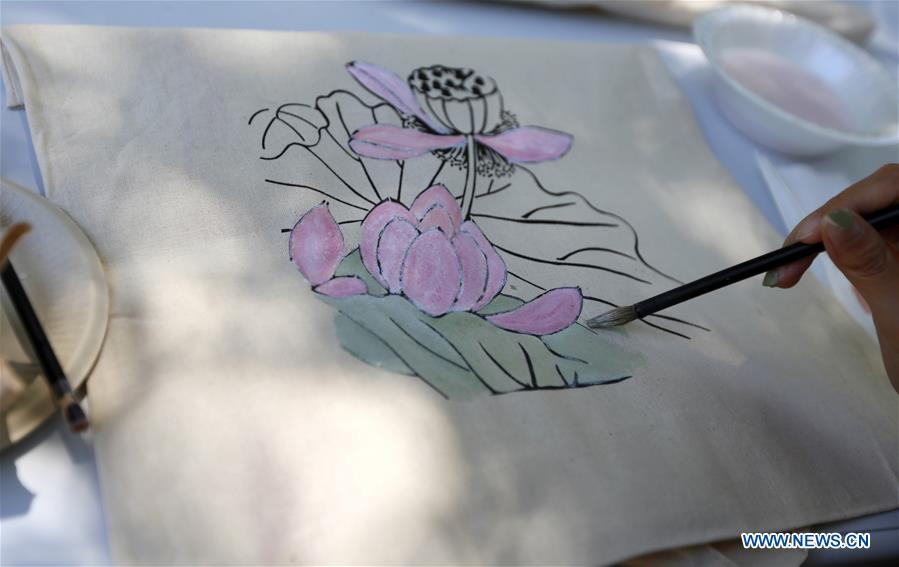 A participant paints during the Summer Family Festival 2019 in Los Angeles, the United States, June 30, 2019. The festival held in Storrier Stearns Japanese Garden features art and music from China, Japan and South Korea. (Xinhua/Li Ying)