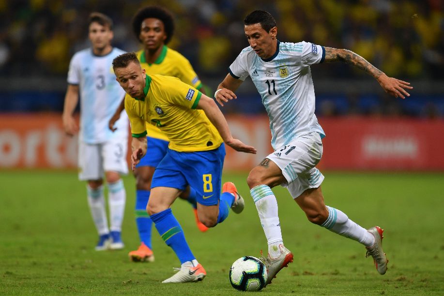 Argentina's Angel Di Maria (R) is marked by Brazil's Arthur during their Copa America football tournament semi-final match at the Mineirao Stadium in Belo Horizonte, Brazil, on July 2, 2019. (Photo by Pedro Ugarte/ AFP)