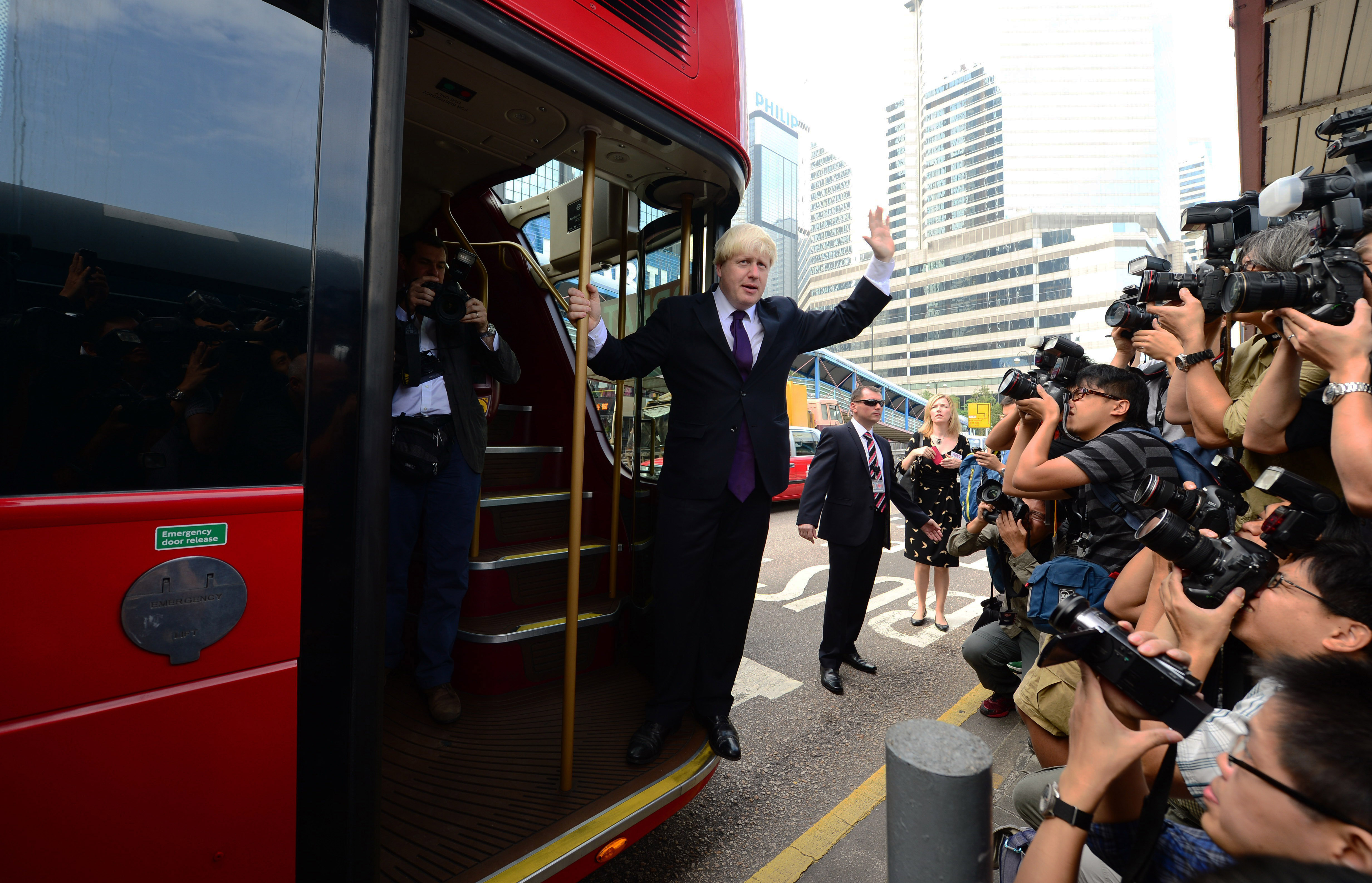 London Mayor Boris Johnson waves to the media while taking a bus in Hong Kong, south China, Oct. 18, 2013. (Xinhua/Qin Qing)