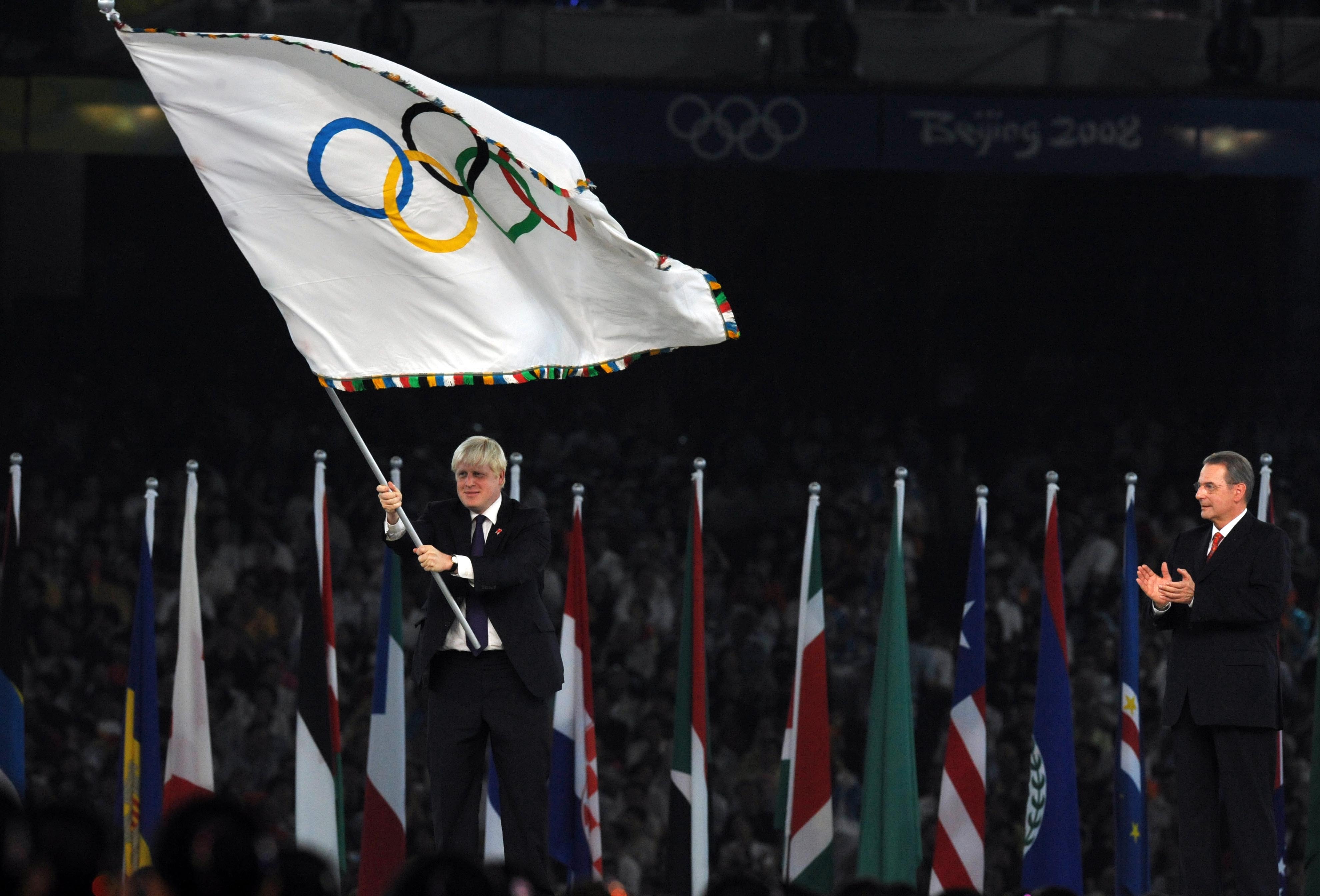 London Mayor Boris Johnson (L) flaunts the Olympic flag at the Beijing 2008 Olympic Games closing ceremony held in the National Stadium, or the Bird's Nest, Beijing, capital of China, Aug. 24, 2008. (Xinhua/Wang Lei)
