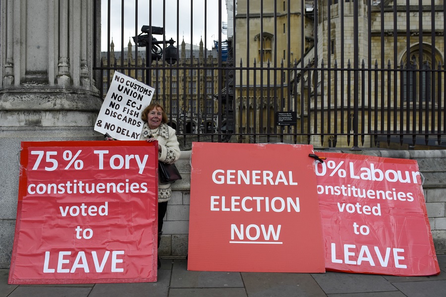 A demonstrator protests outside the Houses of Parliament in London, Britain, on March 19, 2019. (Xinhua/Stephen Chung)