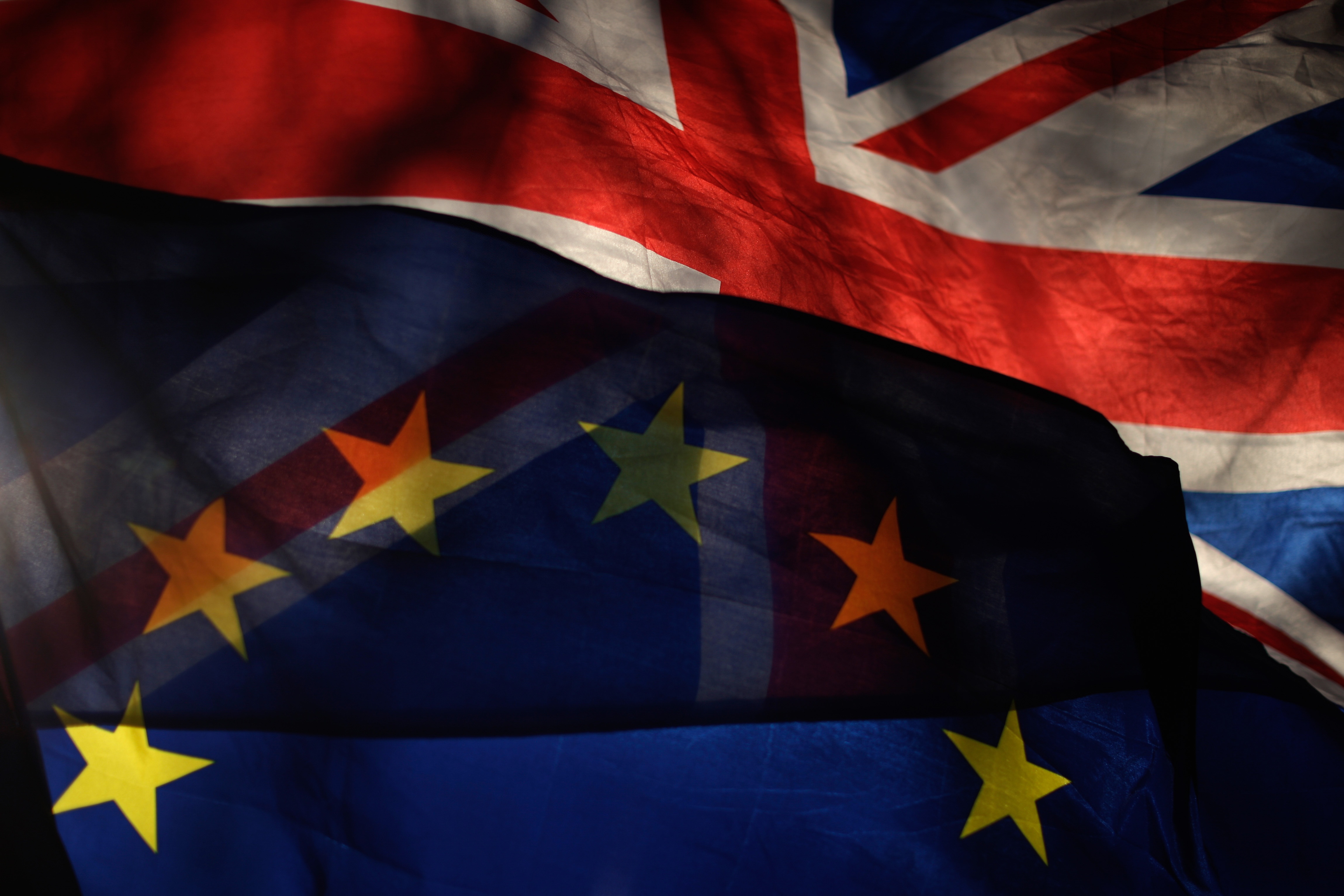 An EU flag is seen in front of a UK flag outside the Houses of Parliament in London, Britain, on Jan. 17, 2019. (Xinhua/Tim Ireland)