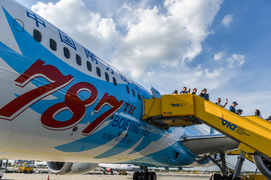 Passengers get off the first flight of China Southern Airlines' Guangzhou-Urumqi-Vienna route at Vienna International Airport, Vienna, Austria, June 18, 2019. (Xinhua/Guo Chen)