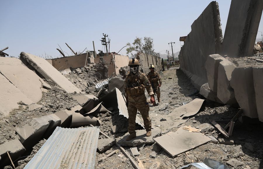 Afghan security force members inspect at the site of the explosion in Kabul, capital of Afghanistan, Aug. 7, 2019, when at least 95 people were wounded after a massive car bomb explosion. (Xinhua/Rahmatullah Alizadah)
