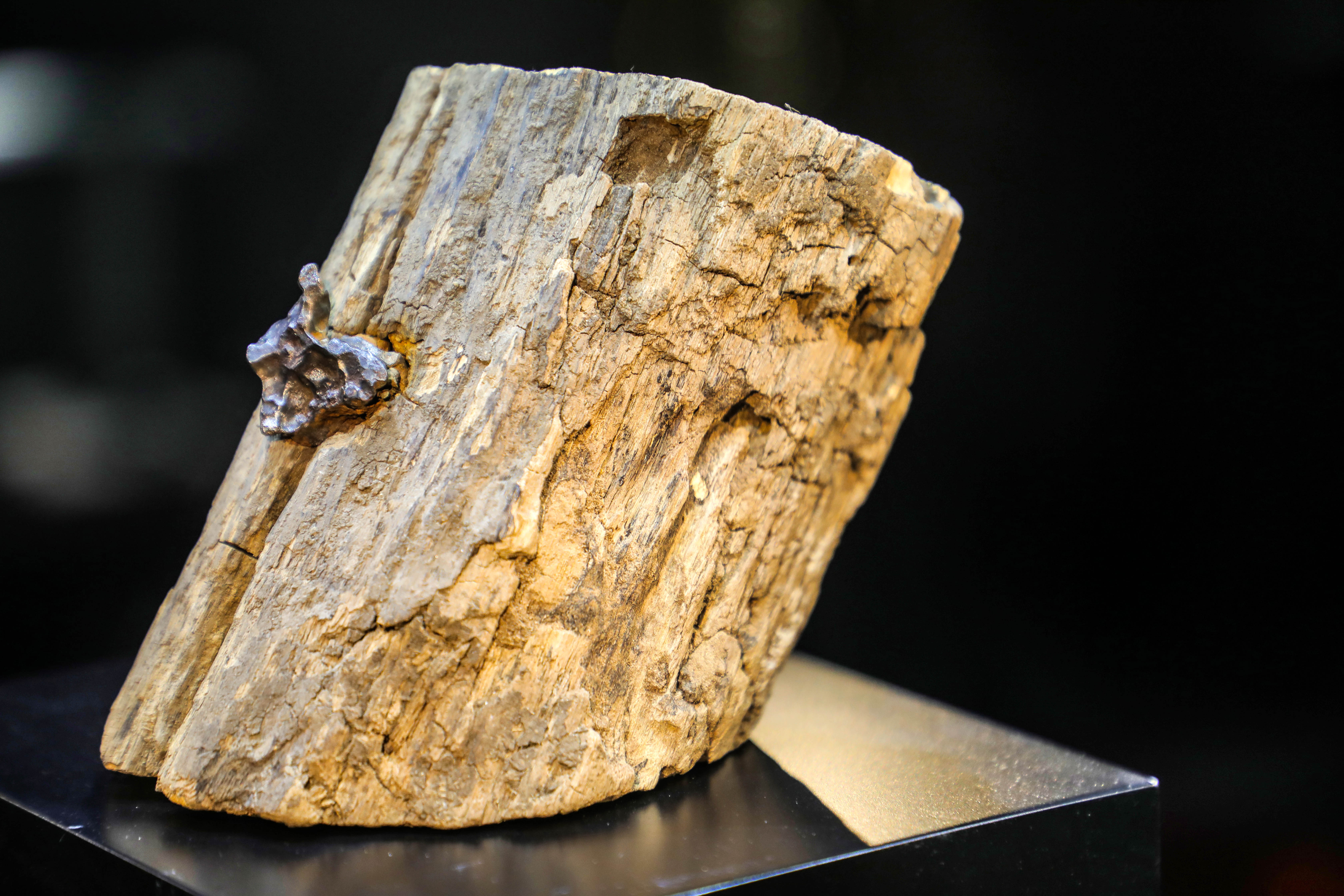 Another striking meteo comes from Russia, which is embedded in a petrified tree branch.