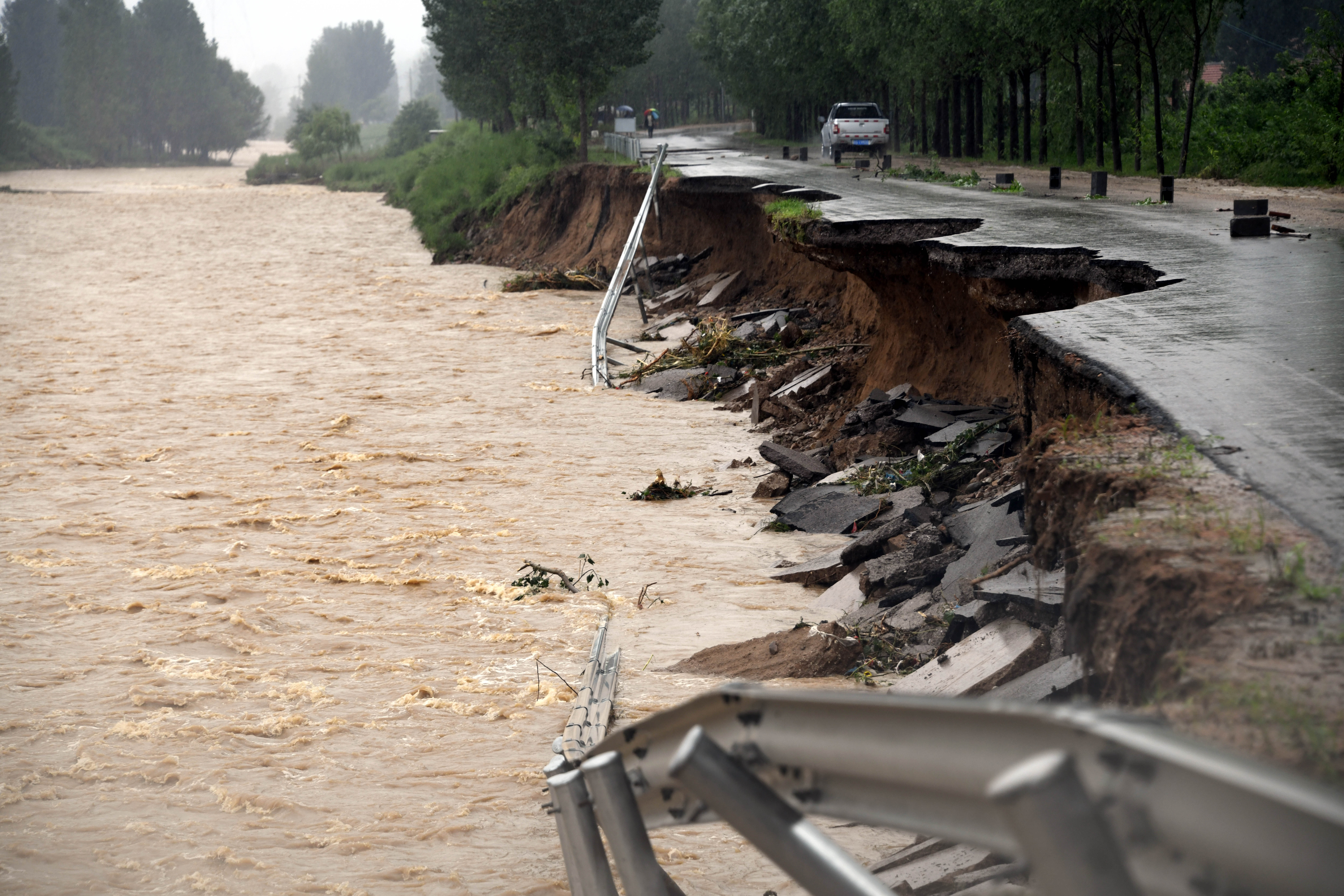A road is damaged by the flood in Xinzhai Township of Linqu County, east China's Shandong Province. (Xinhua/Fan Changguo)
