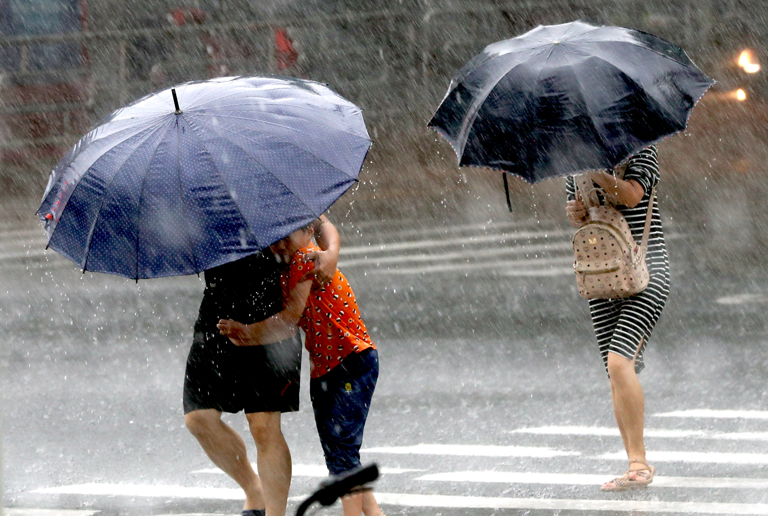 Pedestrians walk against heavy rain on Changning Road in Shanghai, east China, Aug. 10, 2019. (Xinhua/Liu Ying)